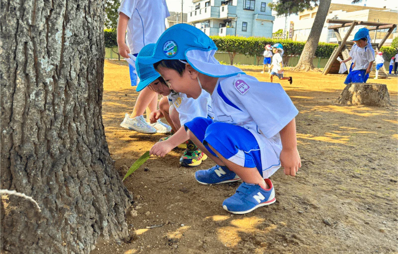 年少さんは木の根元を葉っぱでツンツン!大きなアリの巣を興味津々で見ています。