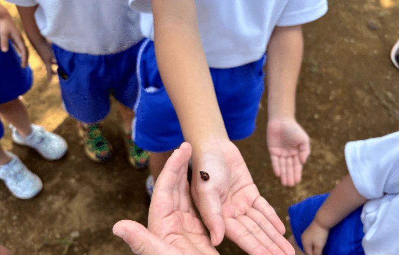 年長の男の子が、「てんとう虫は飛ぶために高い所へ登っていくんだよ!」とみんなに教えてくれていました。
