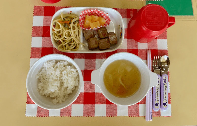 (スプーンとフォークの向きが逆さまですが、年少さんが自分の力で準備を頑張りました😊💓)