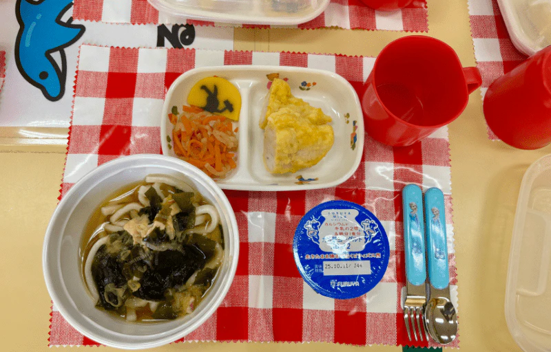 この日のメニューは『冷やしわかめうどん、とり天、大根きんぴら、お月見かまぼこ、カルてつヨーグルト』でした。