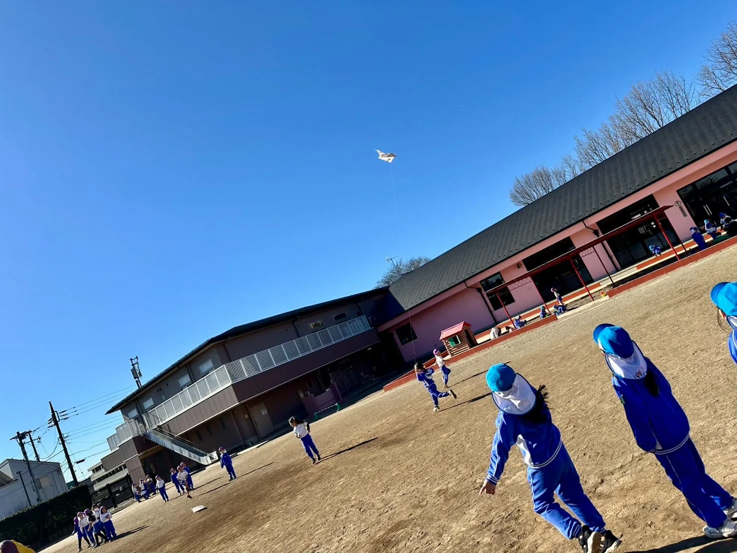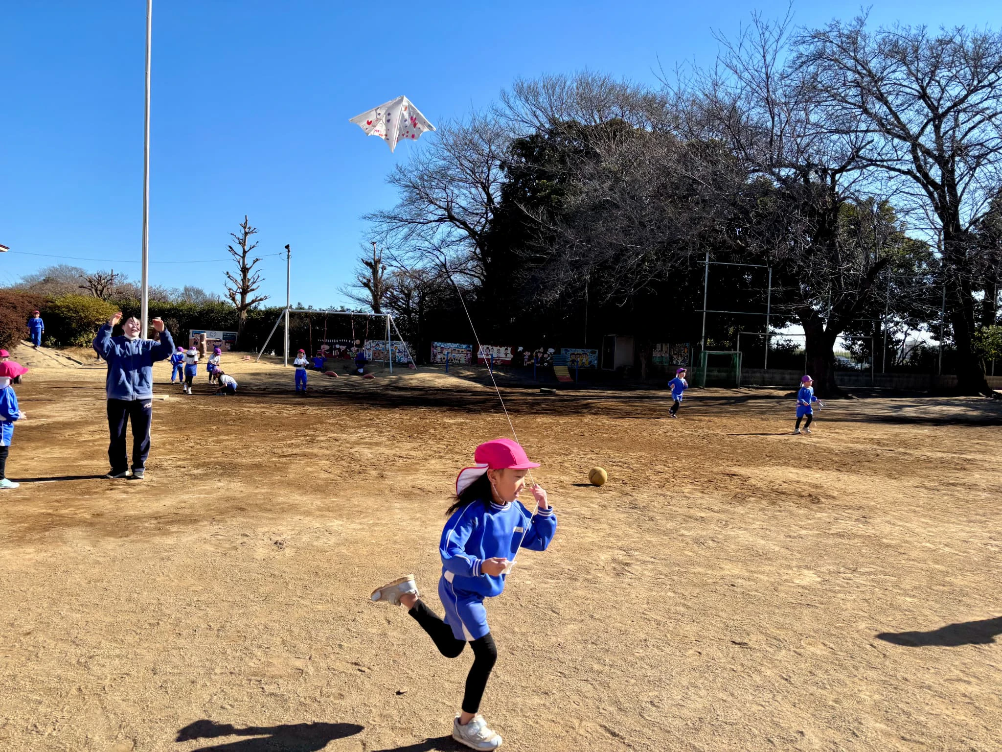 園庭では凧揚げを楽しむ様子が見られています。勢いをつけて、ダッシュ!!!💨